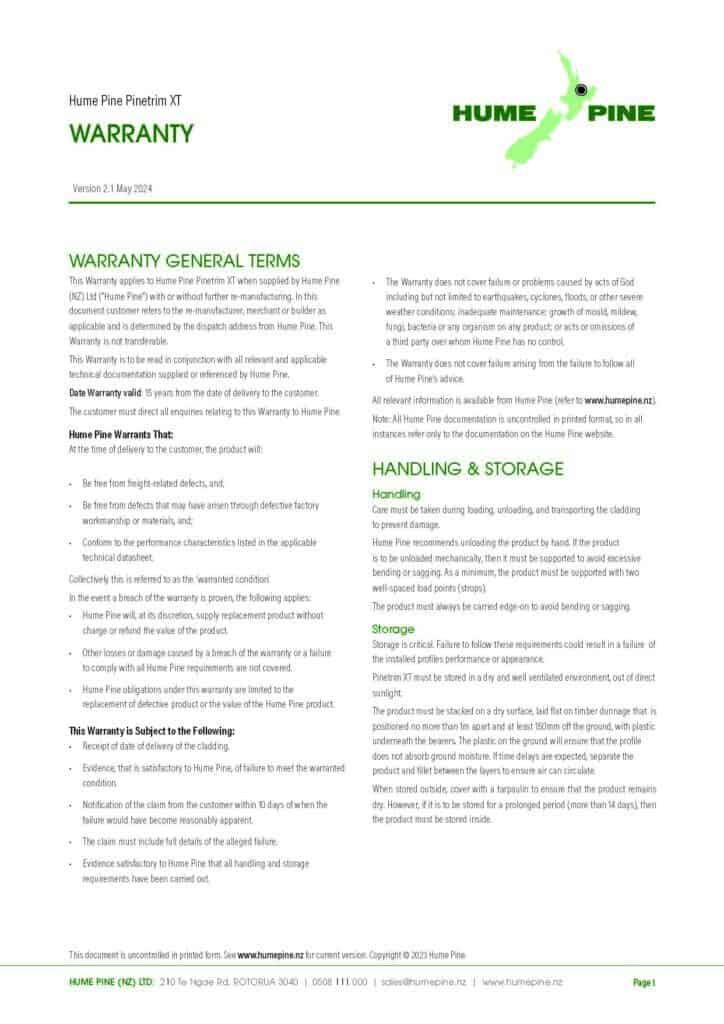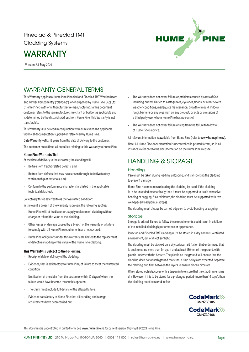 Hume Pine Pineclad & Pineclad TMT Warranty V2.1